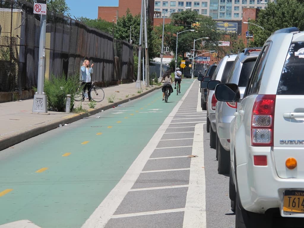 North of Clymer Street, Kent Avenue resumes as a two-way bicycle greenway.