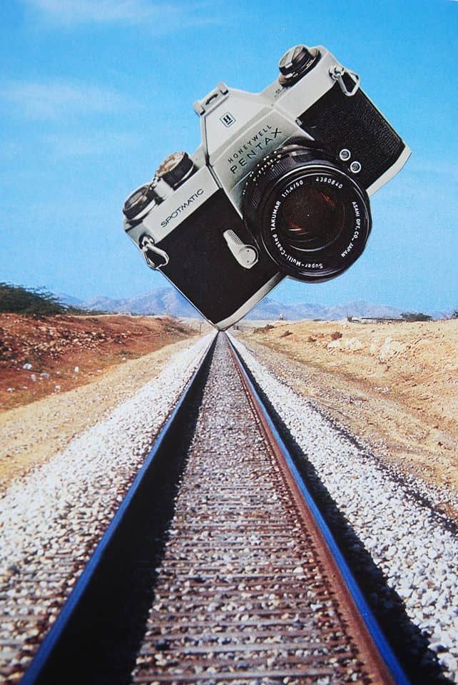 “Pentax on the Tracks,” handmade collage, John Turck