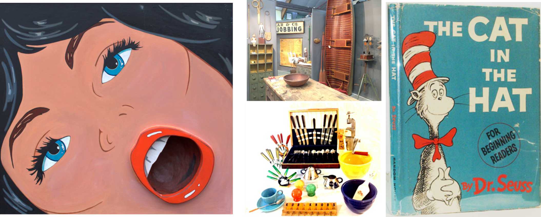Girl with Yellow Rose, Marjorie Strider; vintage tableware; Village Braider; The Cat in the Hat, Dr. Seuss, first edition first printing