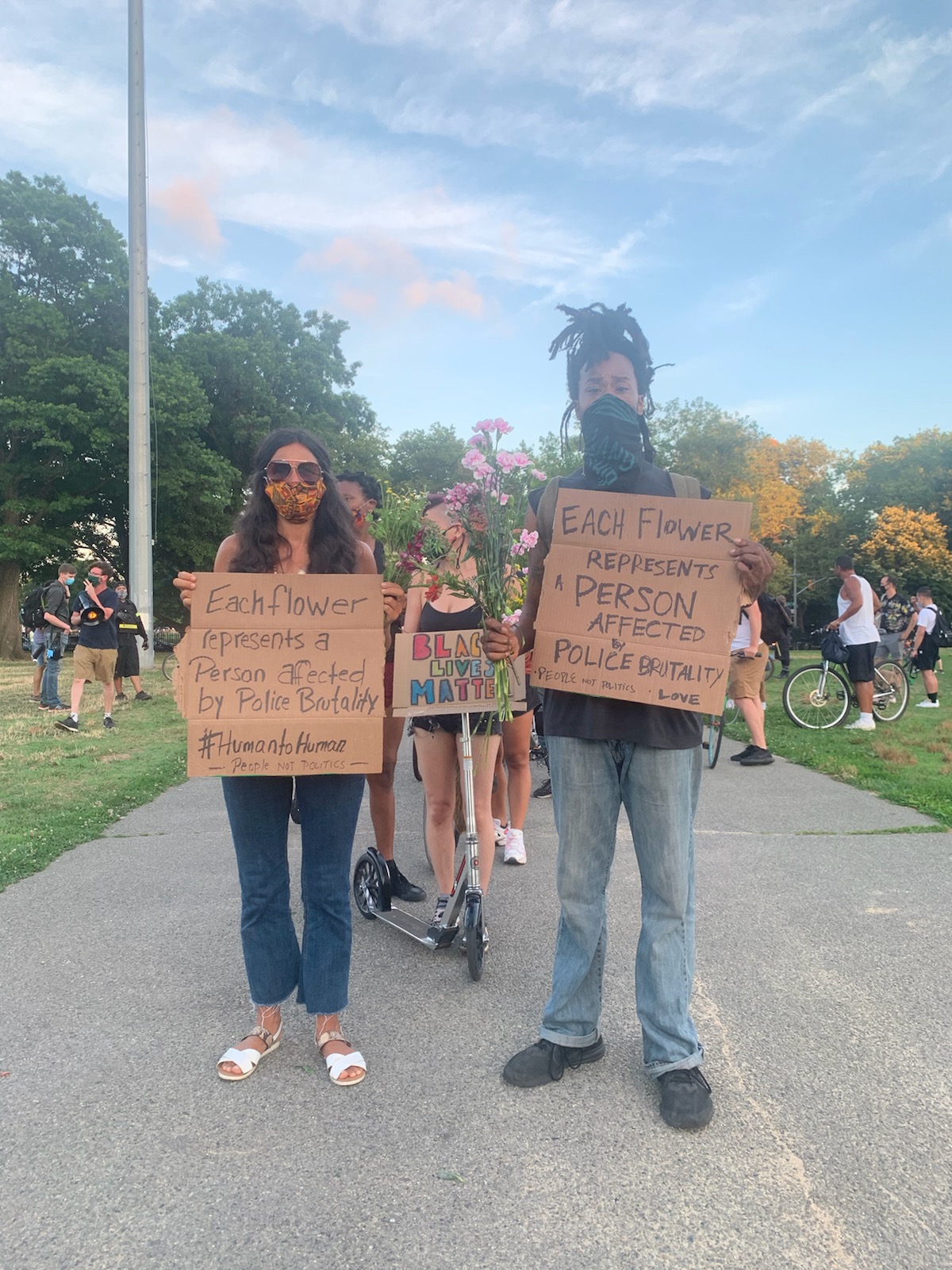 Less than two weeks later, Human X eventually mobilized protestors at the nightly McCarren Park vigil to join him in gifting the 94th precinct hundreds of flowers.