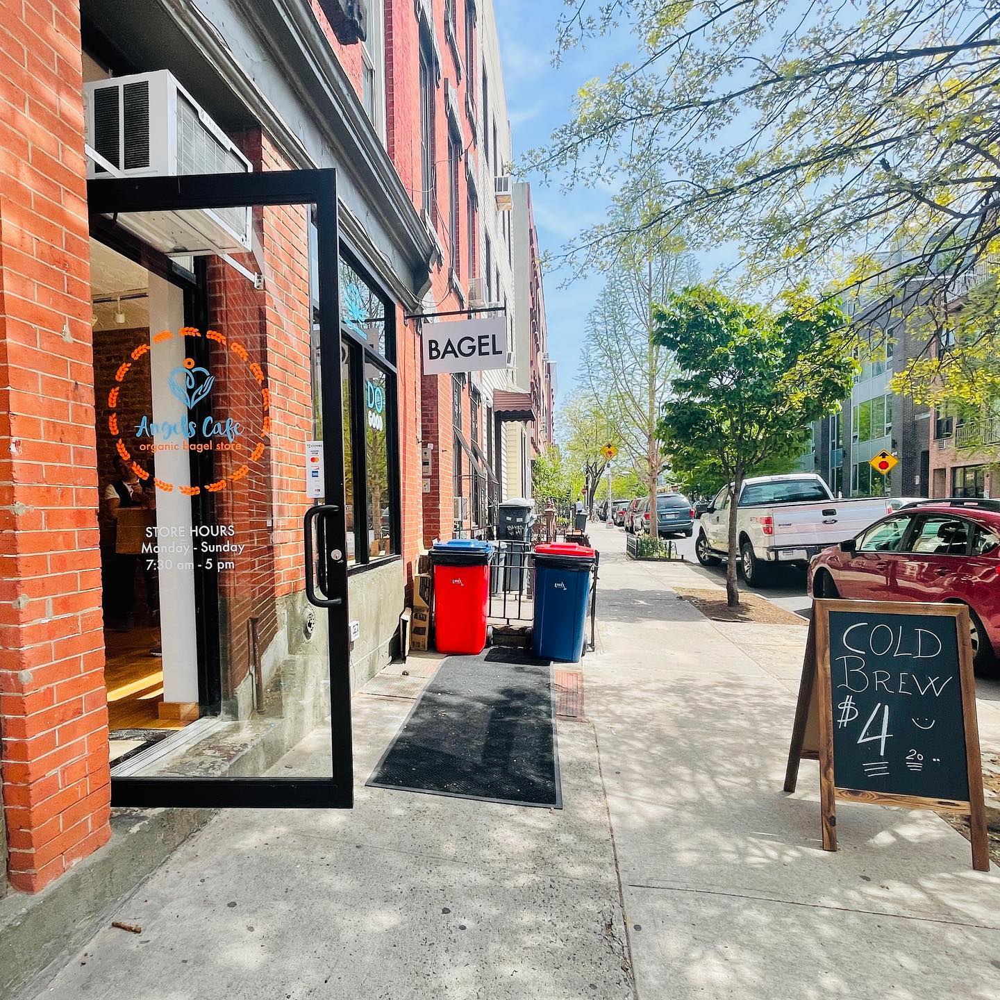 The cafe serves up coffee and organic bagels on a to-go basis and, aside from donating a percentage of its profit. North Brooklyn Angels volunteers are on site daily to prepare fifty breakfasts to be distributed throughout the community. Customers can also make additional donations.