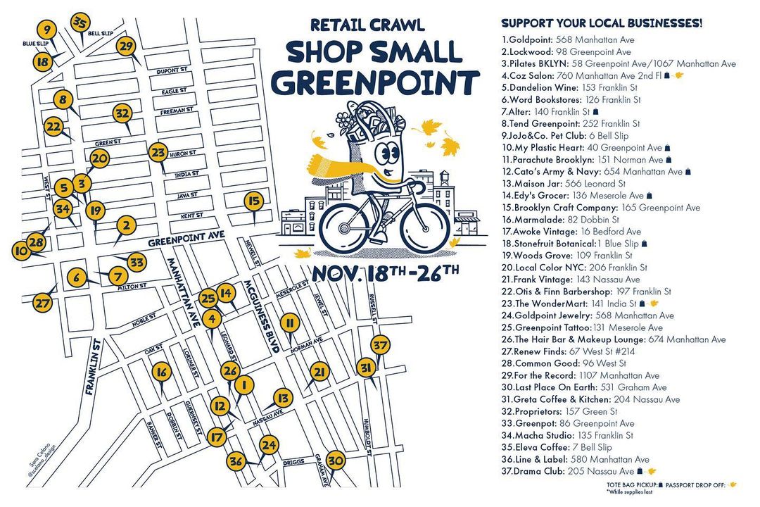 The second annual Shop Small Greenpoint Fall Retail Crawl runs from November 18 – 26 with 37 participating neighborhood businesses! As a refresher, crawl participants can pick up a “passport” at any of the listed businesses — if you spend $10 or more at any three shops, you’ll get a special swag tote (to be picked up at Coz Salon, Edy’s Grocer, Cato’s Army and Navy, The Wondermart, Stonefruit Botanicals, Alter, My Plastic Heart, Drama Club, and Parachute Brooklyn), and if you spend $10 or more at any eight shops, you’ll be in the running for a grand prize drawing of over $1,000 in goodies (just drop off your passport at Coz Salon, The Wondermart, or Drama Club).